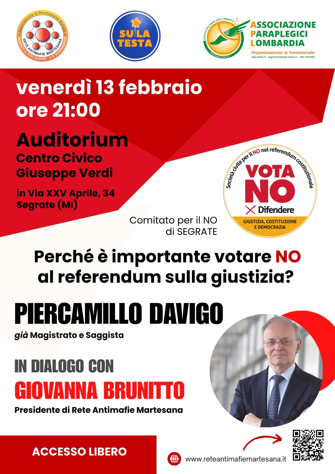 L’obbiettivo è quello di discutere una riforma complessa, per la quale c’è un’evidente «mancanza informativa», secondo quanto sostenuto da Dario Giove, presidente della sezione di Segrate di ANPI. Oggi, Venerdì 13 Febbraio, in collaborazione con la Rete Antimafia Martesana e l’associazione Su la Testa, è previsto un incontro con il magistrato Piercamillo Davigo che si è già espresso più volte a sfavore della riforma costituzionale. L’incontro si terrà venerdì 13 febbraio alle 21 presso l’auditorium del Centro Civico Giuseppe Verdi, in via XXV Aprile, mentre un secondo incontro è previsto per il 21 febbraio.