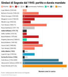 Qui sopra, la nostra infografica con l’elenco dei sindaci che hanno guidato Segrate dal dopoguerra ad oggi